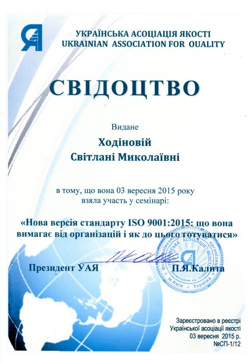 The manager of quality systems PPTE “JNL”was trained to requirements of The new version of the ISO 9001:2015 standard on a seminar carried out by the Ukrainian Association of Quality.