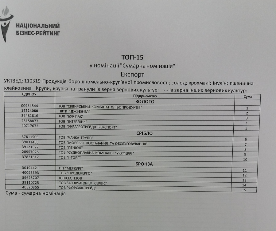 A high assessment of the company's activities is also reflected in the following nominations: 2nd place - in the TOP-100 according to the criterion "Business activity" (Export, HS 071310); 3rd place in TOP-70 in the "Total nomination" nomination (Export, HS 071310); 3rd place in the TOP-40 according to the criterion "Volume of transactions" (Export, HS 110319); 3rd place in TOP-100 according to the criterion "Geography" (Export, HS 071310).