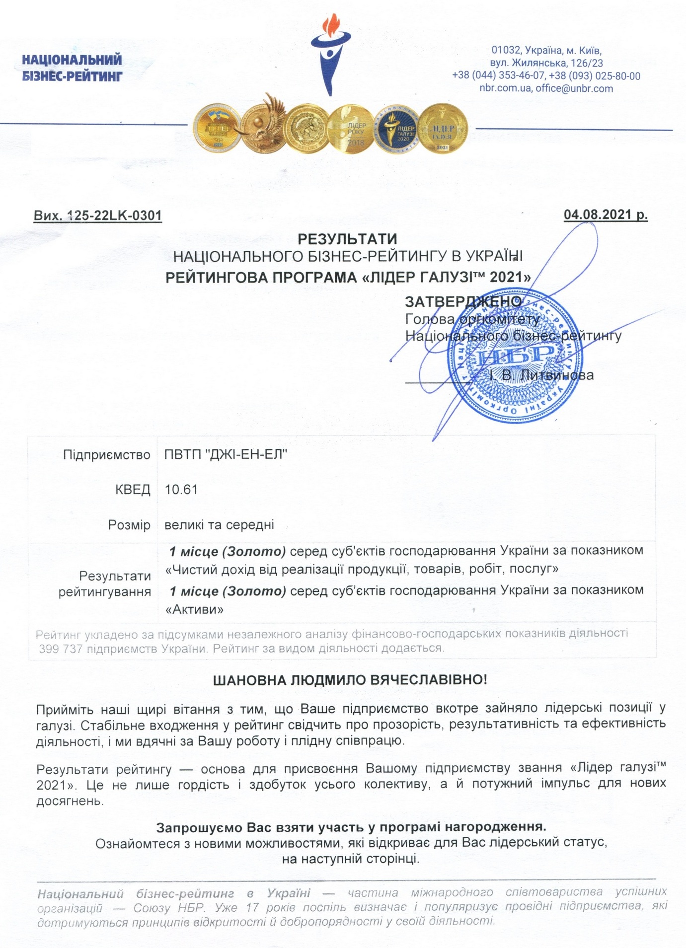 За результатами незалежного рейтингового аналізу від Національного бізнес-рейтингу підприємство "ДЖІ-ЕН-ЕЛ" посіло перше місце (золото) серед суб'єктів господарювання України за показником "Чистий прибуток від реалізації продукції, товарів, робіт, послуг" та серед суб'єктів господарювання України за показником "Активи".